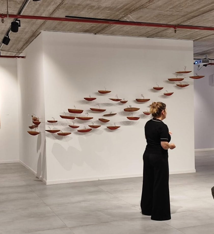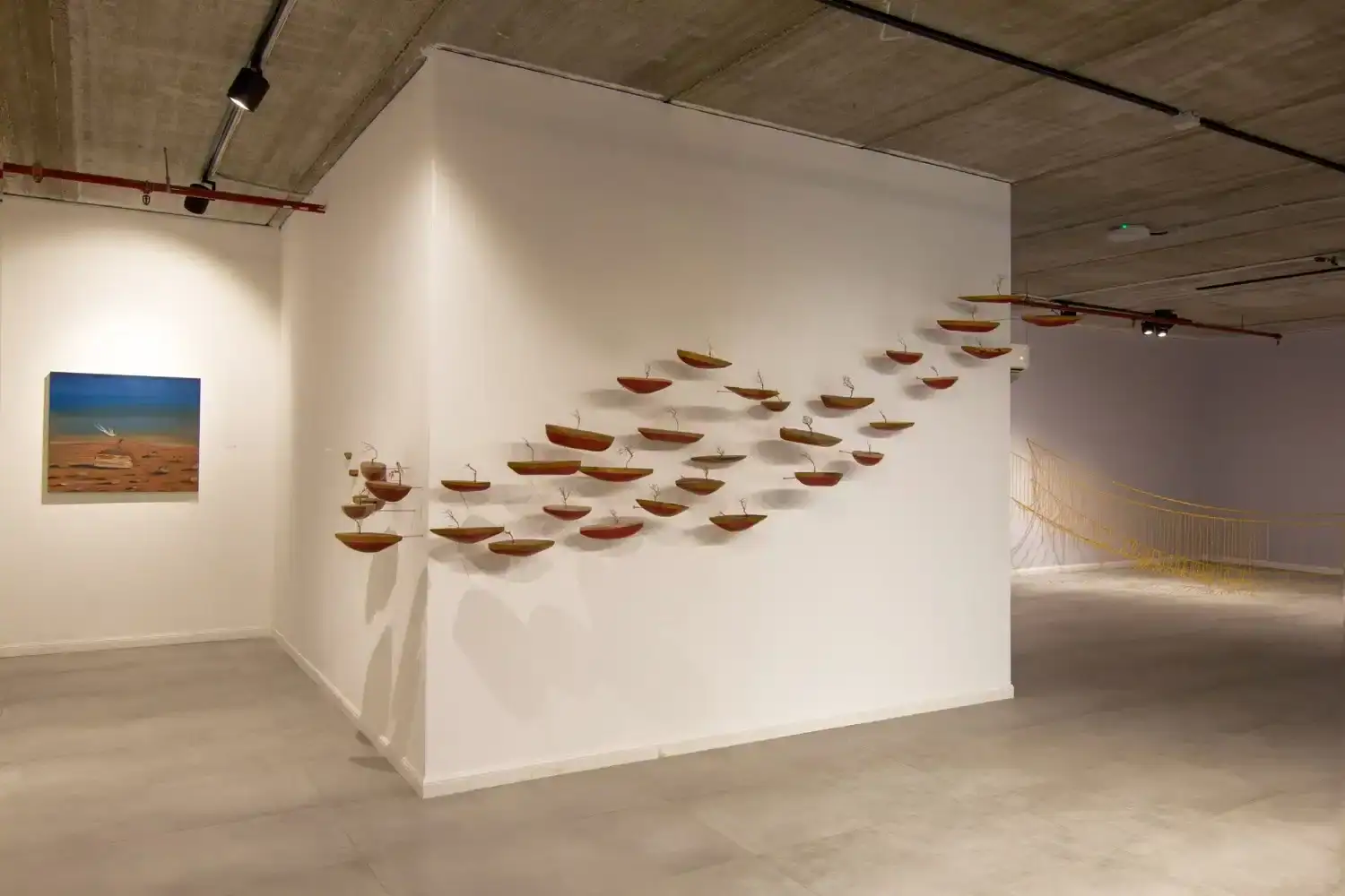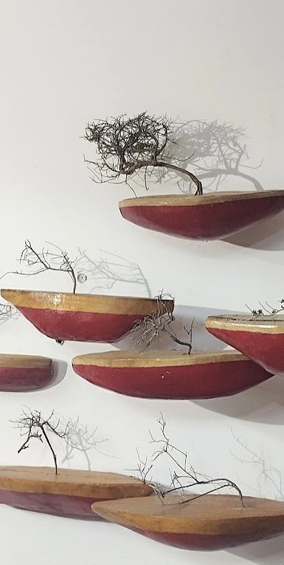 In the work presented here, boats form a flotilla to the other side, which is hidden from our sight. The wave’s shape gives them momentum and they move together as a single entity before our eyes: They float through the air and disappear into the wall. The vision of the tiny trees planted in some of the boats, instead of sails, accords the aerial flotilla a modicum of absurdity as if they were on a quest for a new soil where they can put down roots, in their journey to a mysterious land.